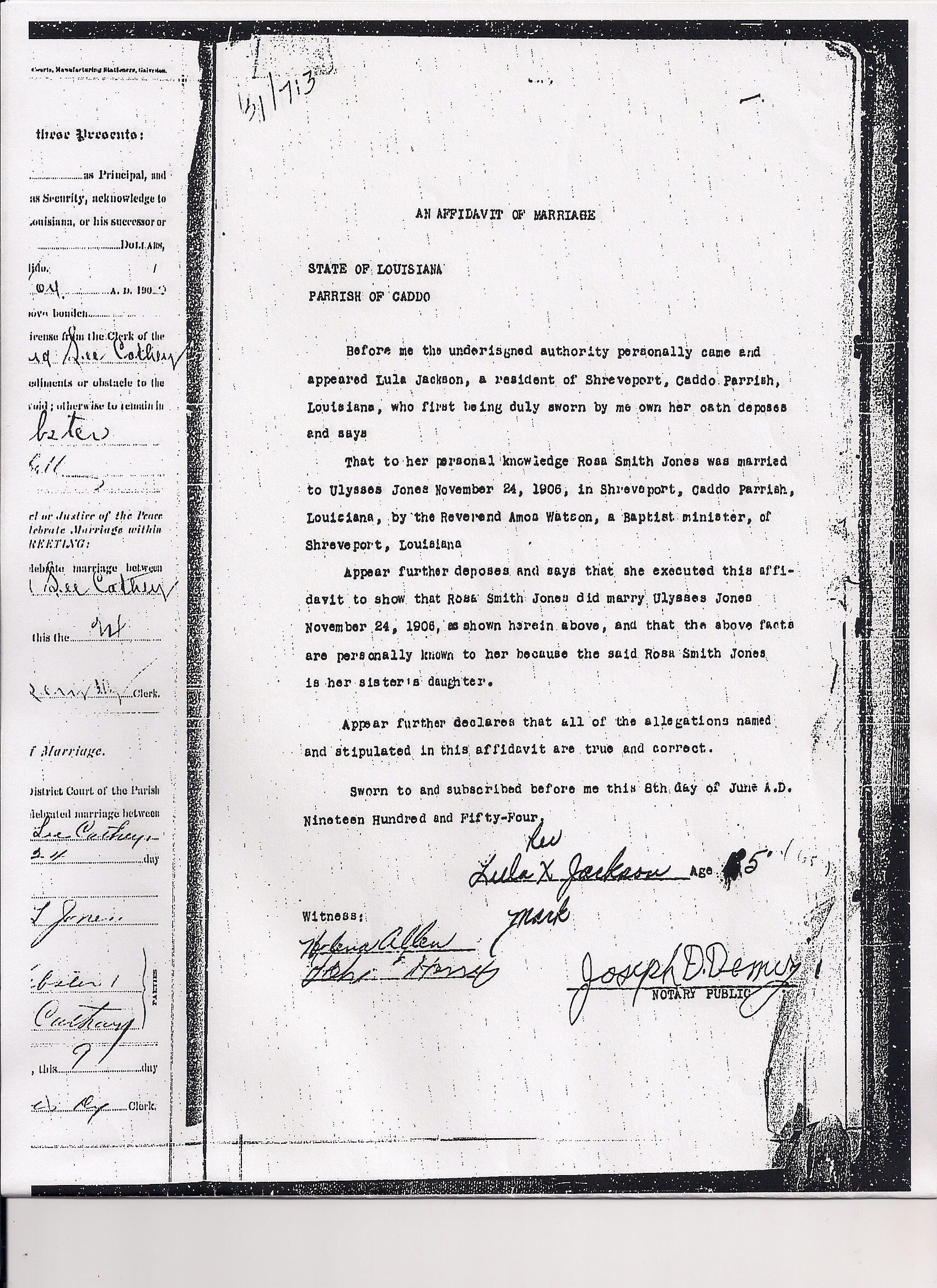 Ulysses was born June 28, 1886 in Homer, Louisiana which is a town in the Parish of Claiborne. He married Rosa Smith November 24, 1906. On a trip to Shreveport I was able to obtain a copy of a deposition/affidavit that was was given in 1954 by Rosa’s aunt, Lula Jackson attesting to the marriage.